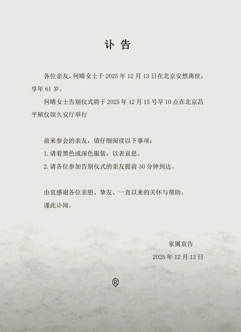 今日知名艺员何阴家族揭橥讣告表现,何阴正在北京坦然离世,享年61岁。辞别典礼将于2025年12月15日早10面正在北京昌仄殡仪馆暂安厅举办。